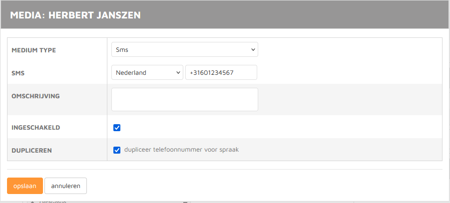 De omschrijving is optioneel samen met de optie om het telefoonnummer te dupliceren voor het mediatype SMS. Kies je voor deze laatste optie, dan wordt bij het opslaan vandit telefoonnummer automatisch ook het mediatype SMS toegevoegd aan de deelnemer.