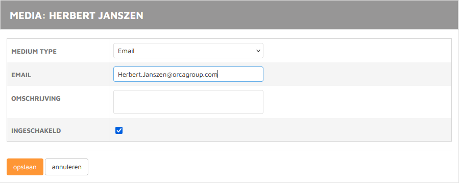 Bij het mediatype email stel je in naar welk emailadres het email bericht moet worden verstuurd bij een alarm en of het medium ingeschakeld of uitgeschakeld is.