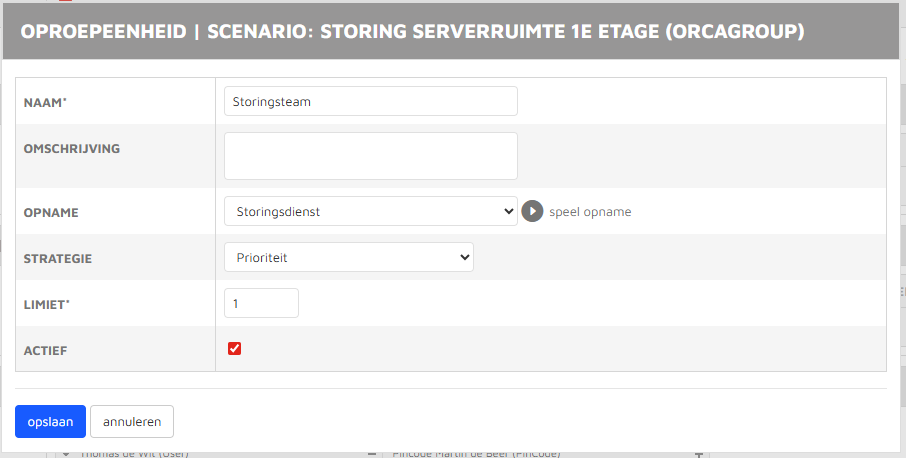 In het geopende pop-up scherm vul je een naam voor de oproepeenheid in en vul je een limiet in. Dit is het minimaal aantal deelnemers dat moet opkomen. In het bovenstaande voorbeeld wordt gestart met het alarmeren van 2 deelnemers. Als je het limiet op 0 laat staan, dan wordt er geen limiet gehanteerd en wordt iedereen in de groep gelijktijdig benaderd.