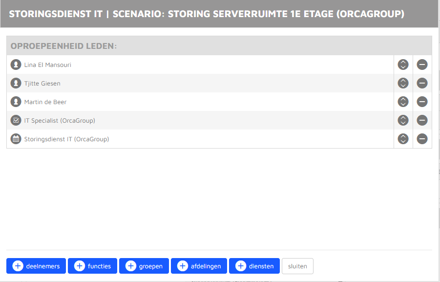Na het opslaan van de oproepeenheid dien je deze te vullen met de deelnemers. Dit doe je via de deelnemers knop in de meest rechtse kolom van de oproepeenheid (oranje knop met 3 personen erin).