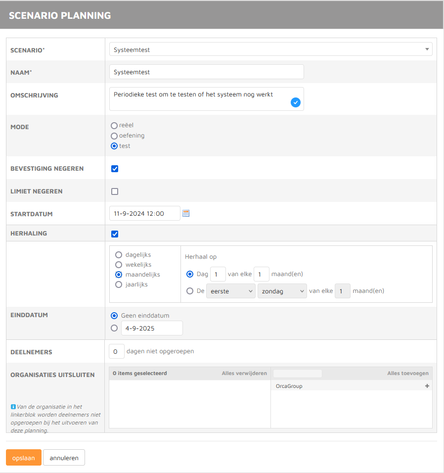 Met de functionaliteit "Scenario planning" kun je een scenario eenmalig of periodiek gepland laten starten in de toekomst. Bijvoorbeeld voor een periodieke test.