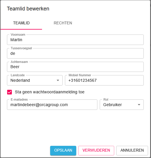 - Wanneer niet ingevuld: Vul achter e-mailadres het e-mailadres in van het teamlid.