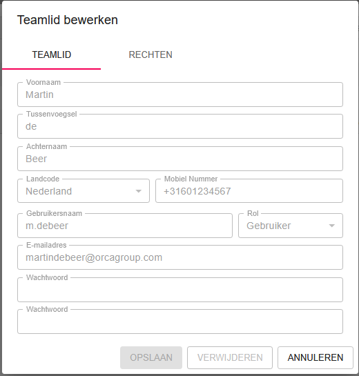 Zoals te zien in de onderstaande afbeelding zijn de velden “grayed out” zodat er geen aanpassingen gemaakt kunnen worden binnen DutyFlow en je enkel de gegevens van teamleden kan inzien.