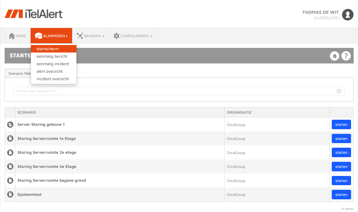 Het startscherm gebruik je om op een snelle en eenvoudige manier scenario’s te zoeken en te starten.