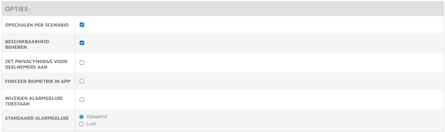 - Ingeschakeld: Deelnemers zien een optie in de app om het alarmgeluid zelf aan te passen (luid of oplopend). Hiermee kan een deelnemer afwijken van de standaard door de beheerder is ingesteld.